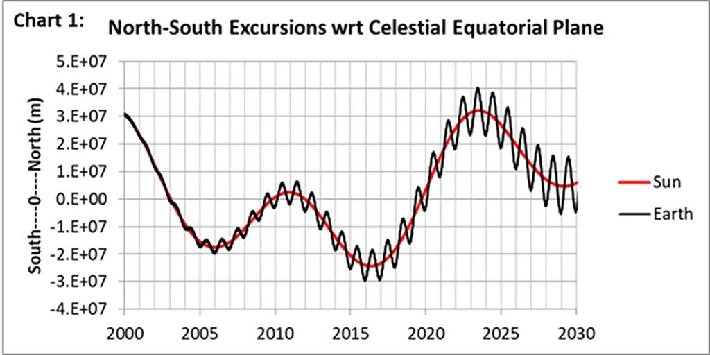 However, to complete the picture of the Sun motion, Chart 1 indicates the North-South excursions from the celestial equatorial plane over the same period as Diagram 1.