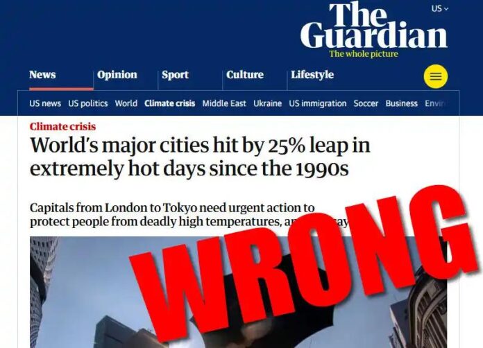 In The Guardian’s op-ed, “World’s major cities hit by 25% leap in extremely hot days since the 1990s,” asserts that global warming has caused a sharp rise in the number of extremely hot days in cities worldwide, citing an International Institute for Environment and Development analysis that claims urban residents from London to Tokyo now experience 25 percent more hot days each year than they did in the 1990s. The claims are highly misleading if not outright false. While cities worldwide have in fact gotten warmer, carbon dioxide increases from the burning fossil fuels are not to blame, rather data strongly suggests that the significant rise in measured temperatures in and around major cities is Urban Heat Island (UHI) effect in response to population growth and development.