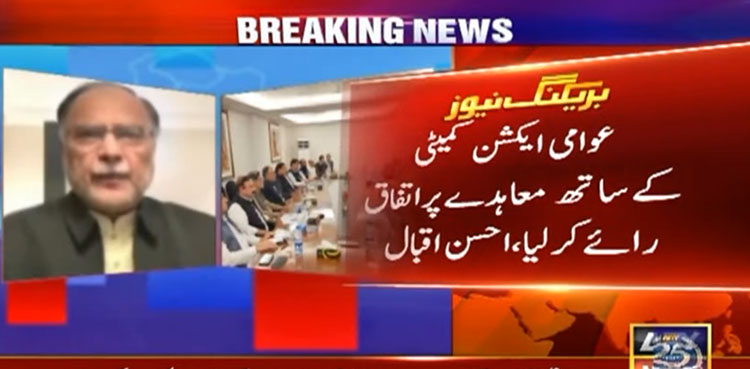 ISLAMABAD: Federal Minister for Planning and Development Ahsan Iqbal announced that the government had reached a consensus agreement with the Awami Action Committee (AAC), ARY News reported.