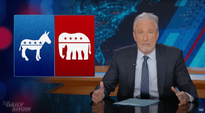 Jon Stewart‘s episode of The Daily Show tonight excoriated the new national “pastime” of the “left-right blame game” following mass shootings.