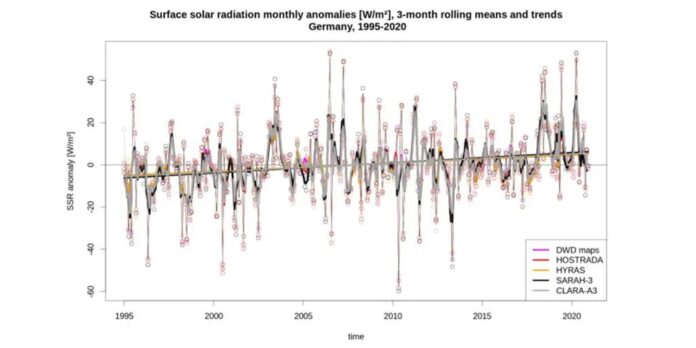 Over Germany, five independent observational datasets all agree that SSR increased by 4 W/m² per decade (~10 W/m²) from 1995-2020.