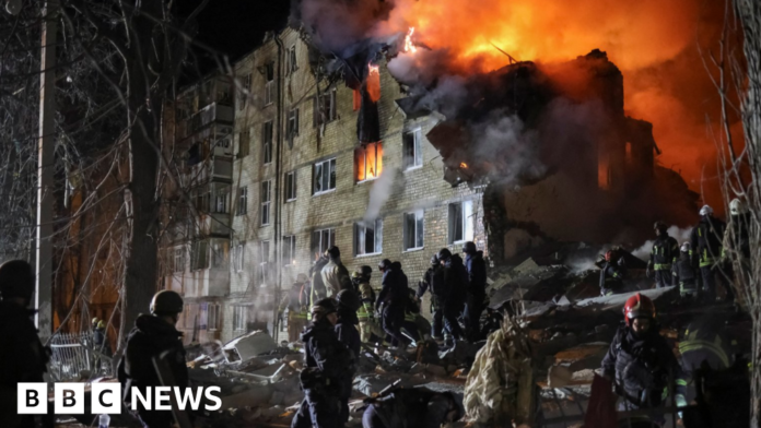 Ukraine President Volodymyr Zelensky says ten other people – including children – are injured as rescuers continue to search through rubble.