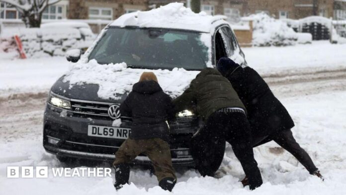 Met Office yellow warnings – valid until 23:59 GMT on Thursday – suggest 2-5cm at low levels, but around 15-20cm of snow is possible over 300m.